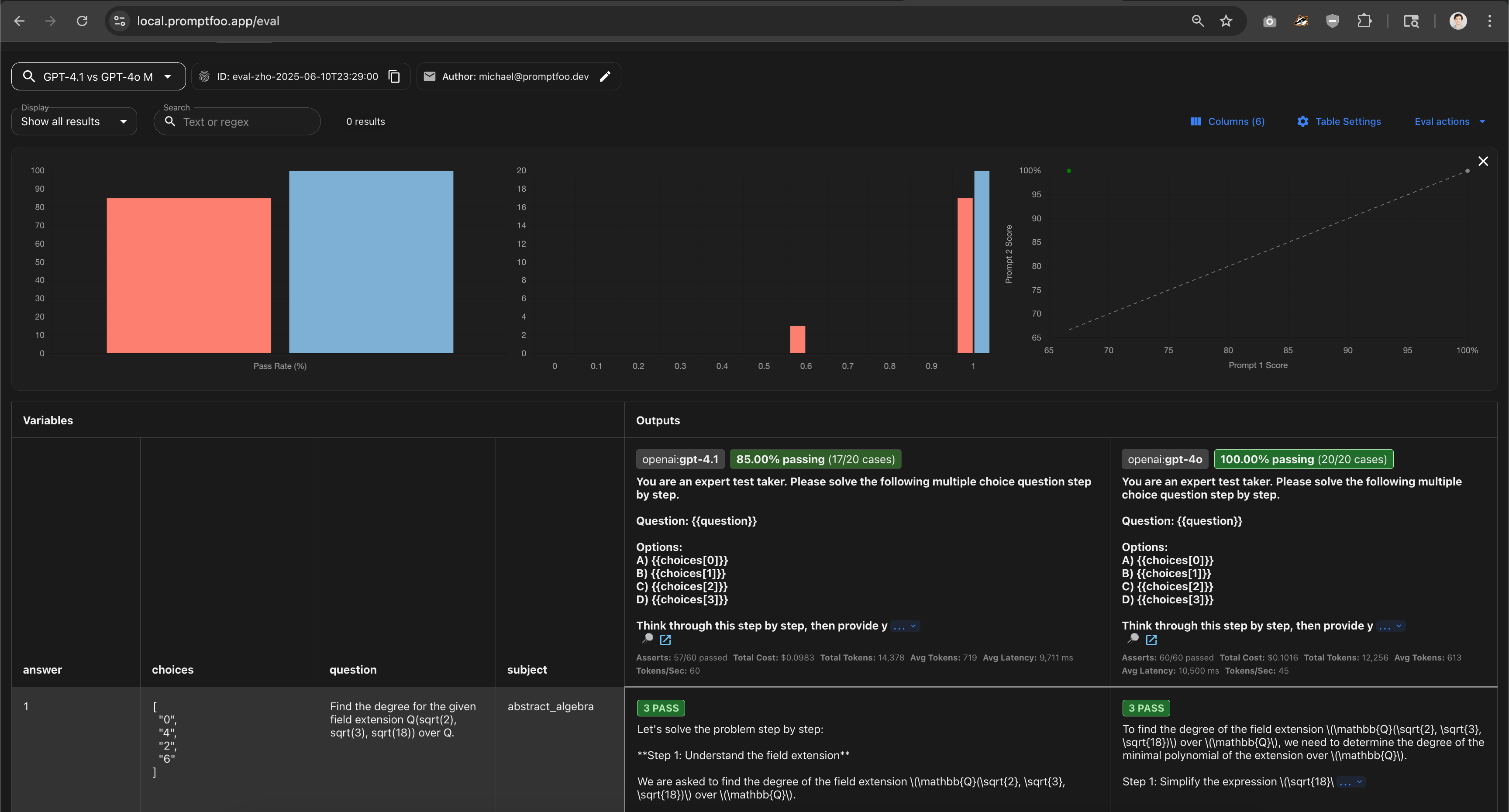 The results above show GPT-4.1 achieving a 92.5% pass rate on MMLU questions, demonstrating the improved reasoning capabilities compared to GPT-4o.